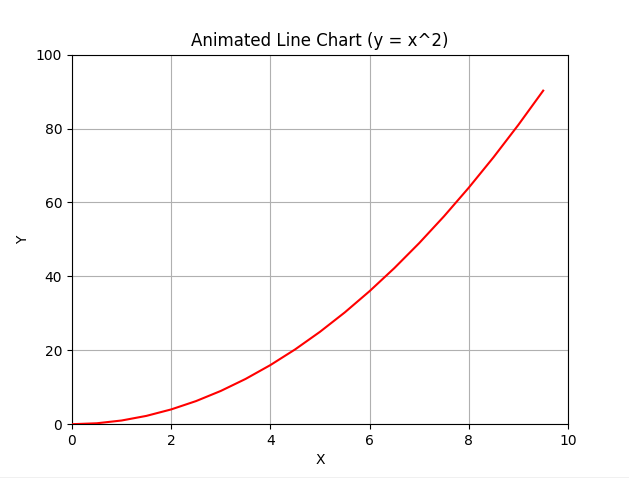 A Python program that creates an animated line chart using Matplotlib’s FuncAnimation class to dynamically update the chart over time.