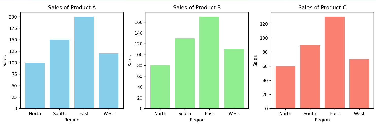This program uses subplots to create multiple smaller plots within the same figure. Each subplot will show sales data for a different region, making it easy to compare the sales across regions side by side.