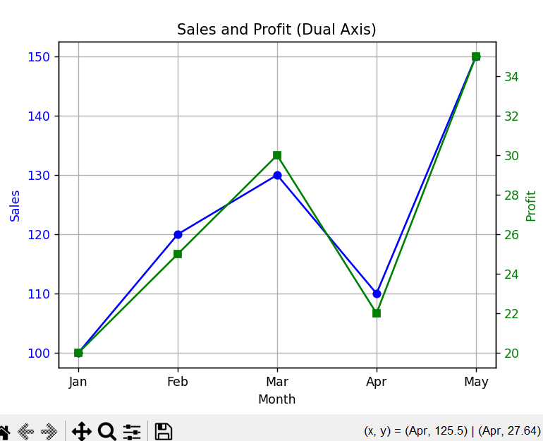twinx() so that two different variables (Sales and Profit) can be visualized on the same x-axis (Months).matplotlib.pyplot is used to make the chart.