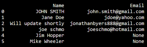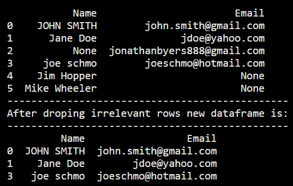 import pandas as pd df = pd.DataFrame([ ['JOHN SMITH', 'john.smith@gmail.com'], ['Jane Doe', 'jdoe@yahoo.com'], [None, 'jonathanbyers888@gmail.com'], ['joe schmo', 'joeschmo@hotmail.com'], ['Jim Hopper', None], ['Mike Wheeler', None] ], columns=['Name', 'Email']) print(df) new_df = df.dropna() print('-----------------------------------------------') print('After droping irrelevant rows new dataframe is:') #i.e rows 3, 5, 6 print('-----------------------------------------------') print(new_df)