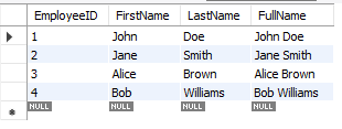 -- Creating Employees4 table with a generated FullName column (MySQL syntax)