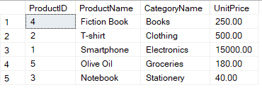 The main query fetches all products whose price matches that max — this covers multiple most expensive products per category.