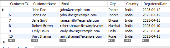 ● INSERT INTO CustomerInfo: This inserts the provided customer information (Name, Email, City, Country, RegisteredDate) into the CustomerInfo table.