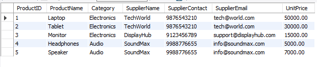 (1, 'Laptop', 'Electronics', 'TechWorld', '9876543210', 'tech@world.com', 50000.00),