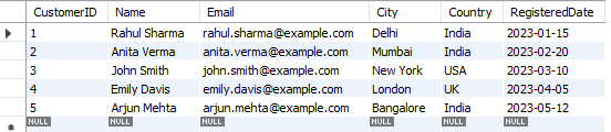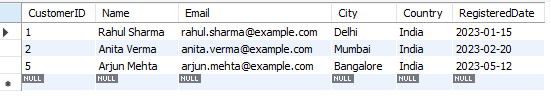 SELECT * – Retrieves all columns from the table.FROM Customers – Indicates that the data should be fetched from the Customers table.WHERE Country = 'India' – Filters the results to include only customers from India.SQL Query: