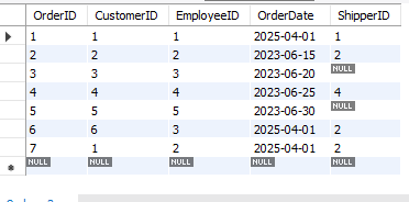 ● WHERE ShipperID IS NULL – Filters the results to show only those orders where the ShipperID is not assigned (NULL).
