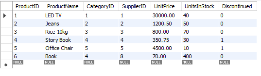 products Table: