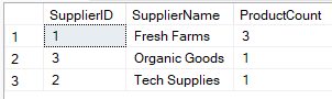 GROUP BY S.SupplierID, S.SupplierNameGroups the results by each supplier to calculate the total number of products they supplied.