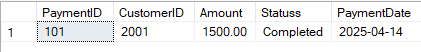 INSERT INTO Payments (PaymentID, CustomerID, Amount, Status, PaymentDate)