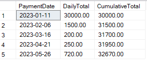"Cumulative total" → we use SUM(DailyTotal) OVER (ORDER BY PaymentDate) to calculate the running total of payments day by day in ascending order.