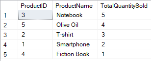 Top10SellingProducts, displays the top 5 best-selling products based on the total quantity sold.Products and OrderDetails tables, groups the data by ProductID and ProductName, and orders them in descending order of total sales.