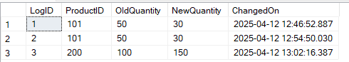 EXEC dbo.LogInventoryChange @ProductID = 101, @OldQuantity = 50, @NewQuantity = 30;