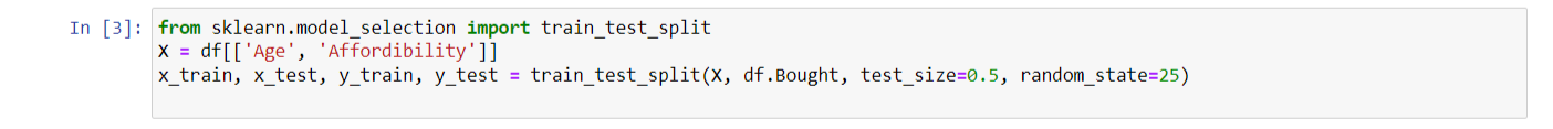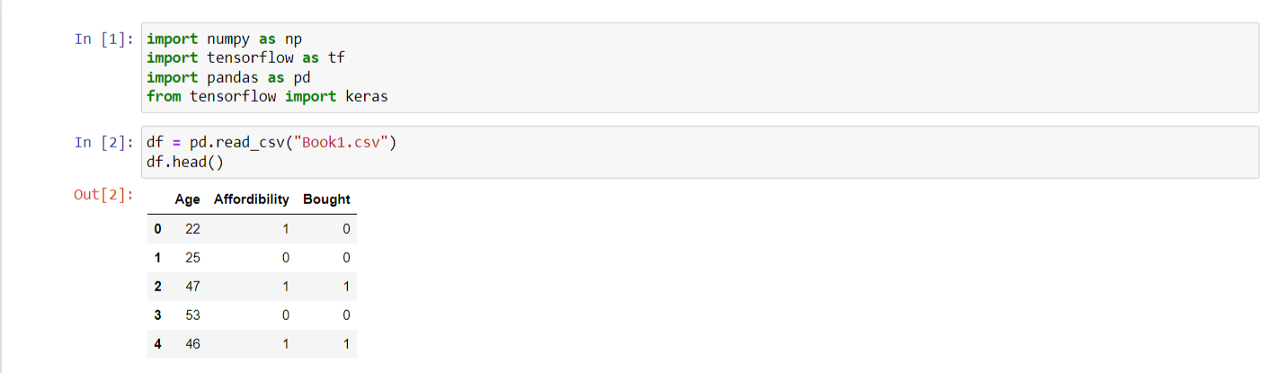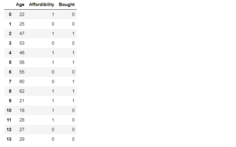 Here, we created a csv file with some data, including the age, affordability, and bought columns.