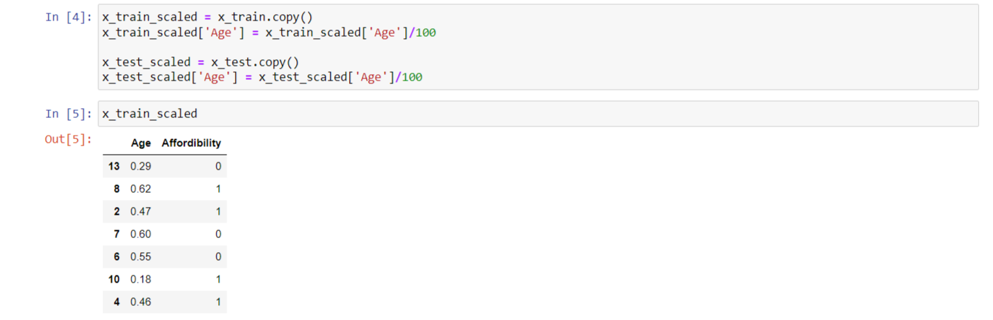 Example: Training a model to predict whether a person will buy insurance or not depends on their age and affordability.