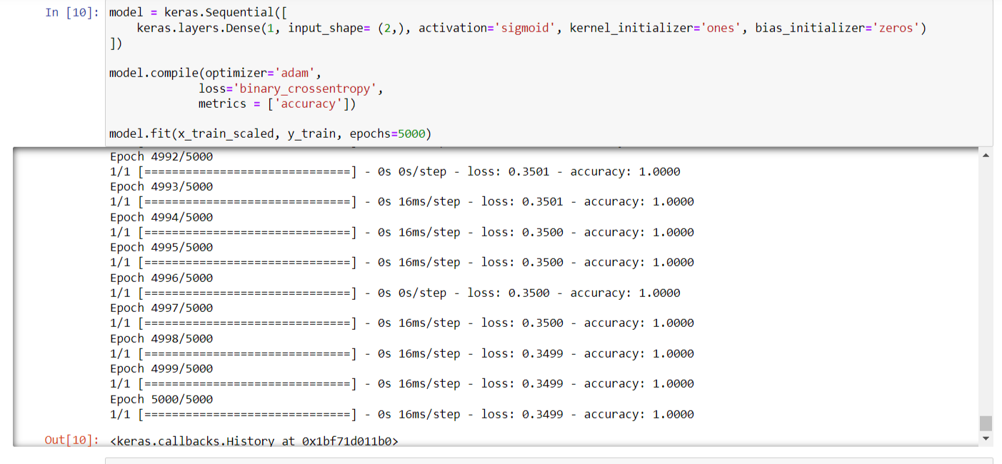 In this code, we declare our model with some required parameters. We've then trained the model using the fit() method and the x_train_scaled and y_train data. During training, the model uses gradient descent to adjust the weights and biases of the network in the direction of the steepest descent of the loss function.