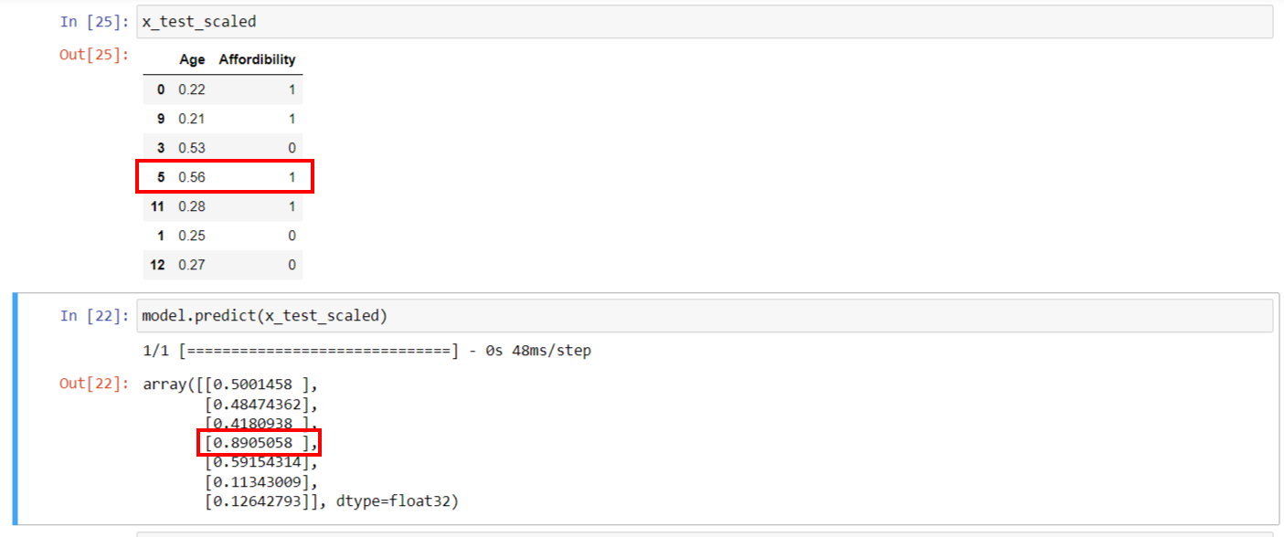 In this image, we can clearly see that the prediction for the data at index value 5 (age = 56, affordability = 1) is almost near 0.90, and for the rest of the data, it is below 60. So, according to the prediction, the person with index value 5 will buy the insurance and the rest will not. And it is correct according to our CSV file.