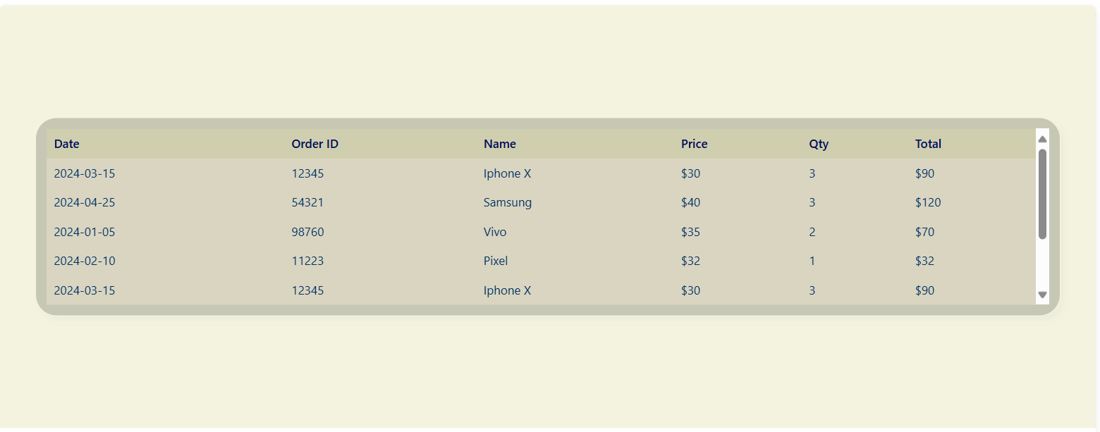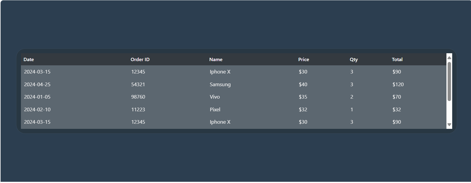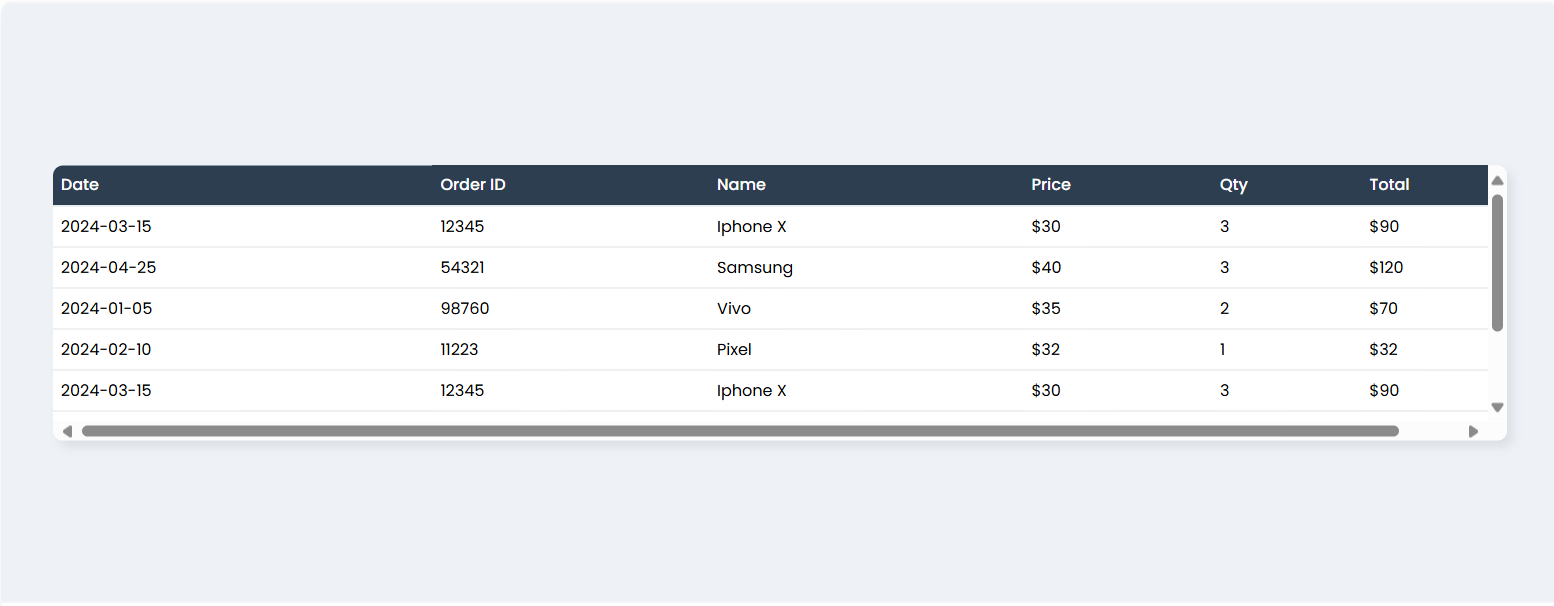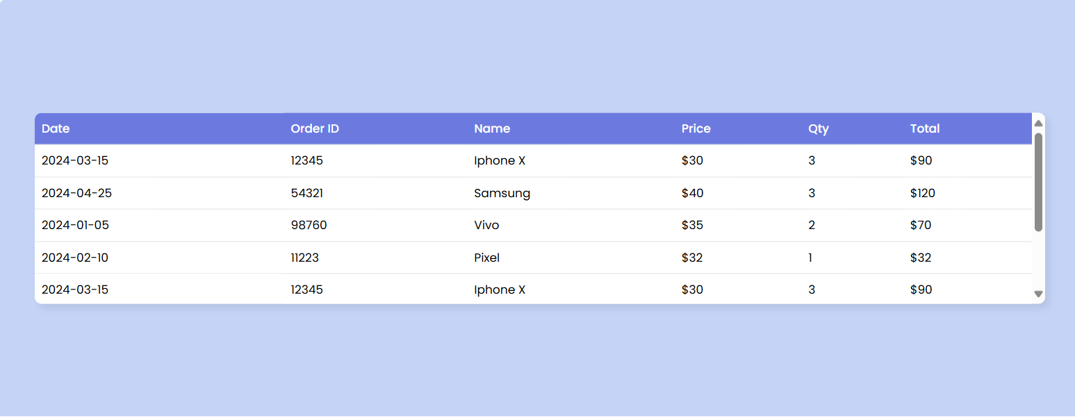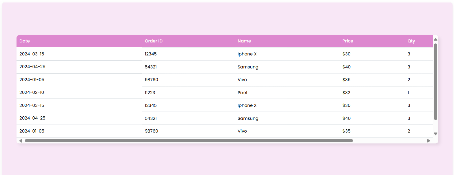 This table combines simplicity and functionality with a vibrant purple header and a clean, shadowed design. It’s responsive, easy to customize, and perfect for straightforward data presentation in applications like e-commerce or inventory systems. The vertical scrolling and compact layout make it ideal for handling large datasets in a constrained space.