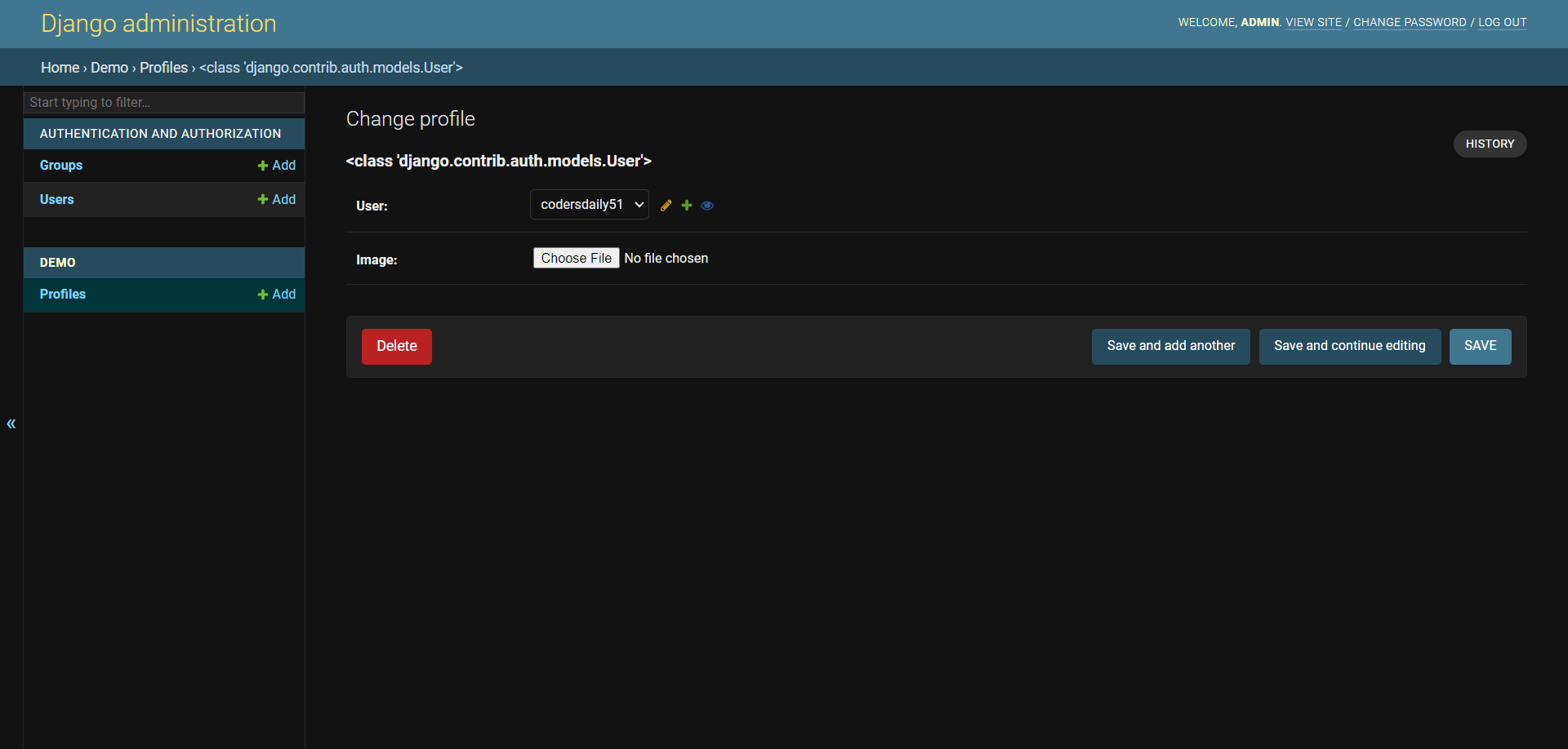 Here, we have imported User and as we want to take image input from the user, therefore, we imported Image from a python image library. Then, we created a Profile class and added a user and image field. OneToOneField is used when one record of a model is related to one record of another model.