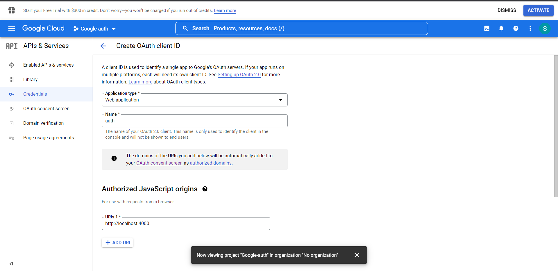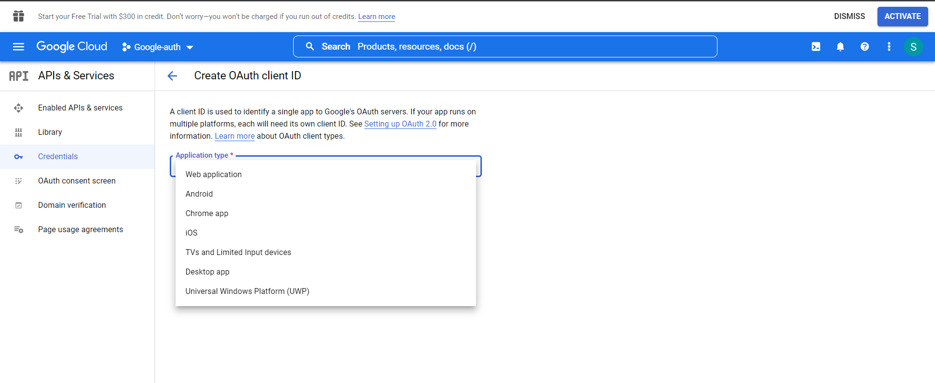 - Now click on credential on the left-hand side and again Click on CREATE CREDENTIALS, then select OAuth client ID. Select an Application type from the options.