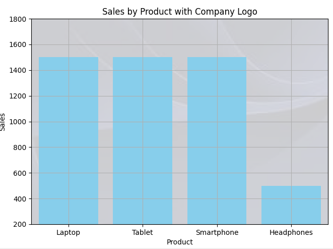 A Python program that displays a bar chart of sales data and overlays a semi-transparent company logo as a watermark using matplotlib.