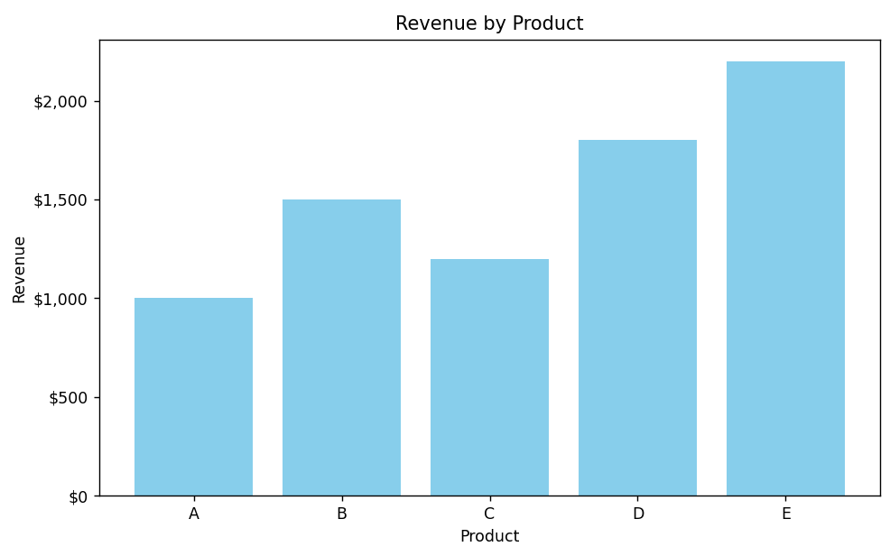 A bar chart is plotted using plt.bar(), where each product's revenue is displayed.