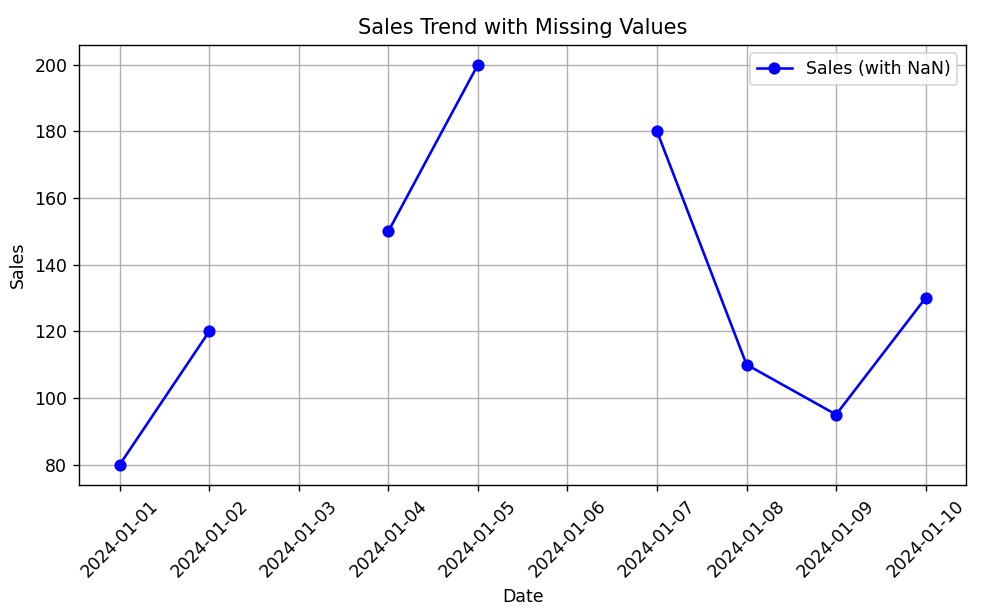 'Sales': [80, 120, np.nan, 150, 200, np.nan, 180, 110, 95, 130]