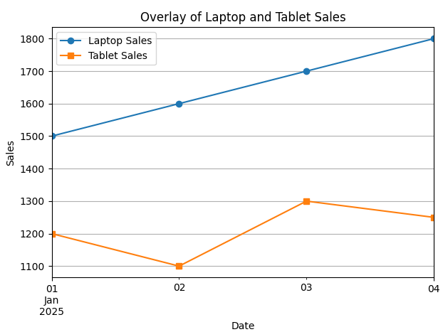 ● Sales data for 'Laptop' and 'Tablet' is stored in a dictionary and converted to a DataFrame.