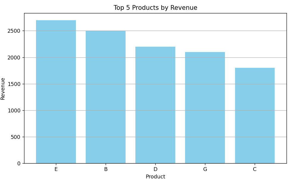 matplotlib.A sample dataset with products and their revenue is created using a dictionary.