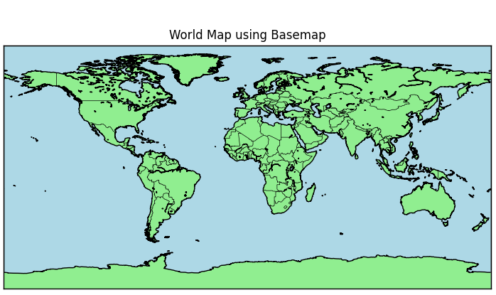 ● m.drawmapboundary(...): Fills the oceans with light blue color.