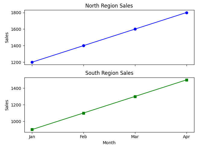 matplotlib.pyplot for plotting the charts.plt.subplots(2, 1, sharex=True) to create two vertically stacked subplots that share the x-axis (month names).ax1.plot(...) and ax2.plot(...) plot the sales data for the North and South regions.set_title(), set_xlabel(), and set_ylabel() add clear labels and titles to both subplots.plt.tight_layout() ensures there’s no overlap between subplots.plt.show() displays both subplots together in a single figure.