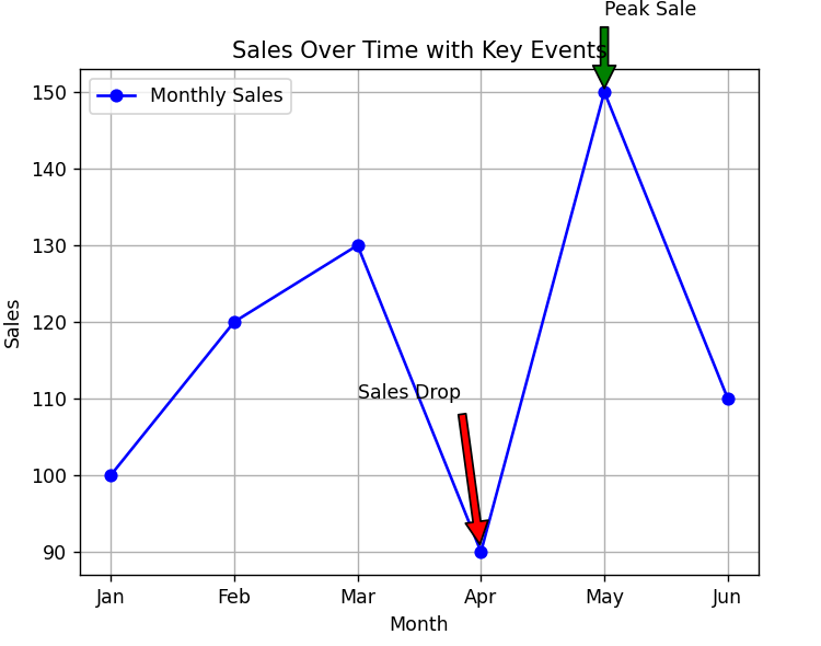 This program plots a time series line chart and uses annotations to highlight important events (e.g., spikes, drops, or milestones).