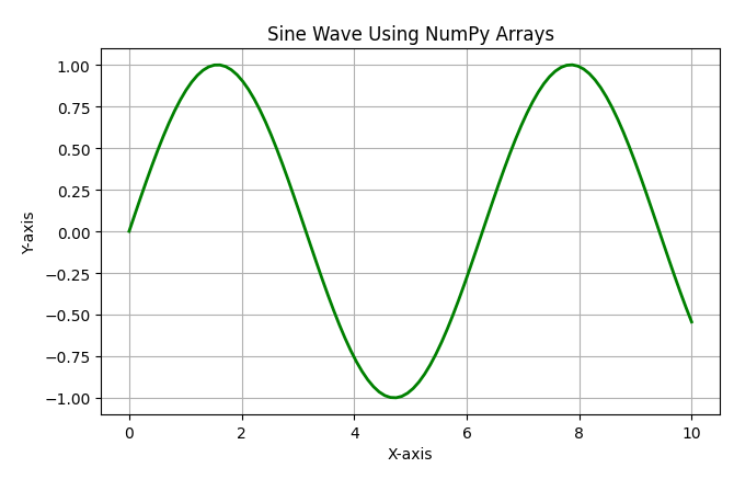 ● plt.plot() plots the sine wave using NumPy-generated data.