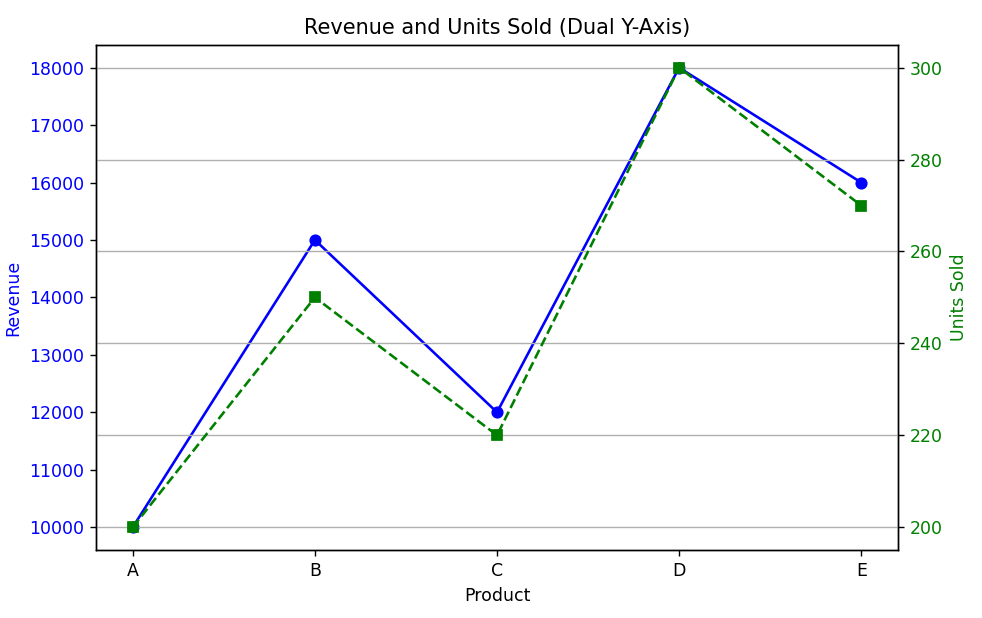 This program plots two different data sets — revenue and units sold — on the same x-axis (products or time), but using two y-axes to handle different scales.
