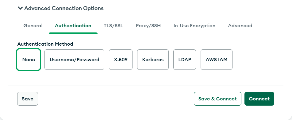 - Select your Authentication method: Username/Password, X.509, Kerberos, LDAP, and AWS IAM.