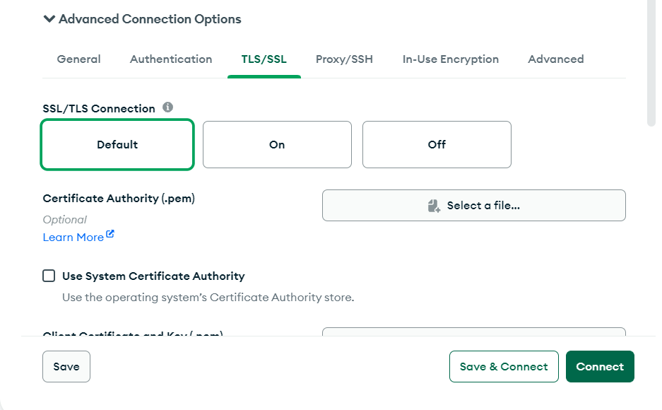 You can leave TLS unset with the Default option or set the TLS / SSL connection On or Off.
