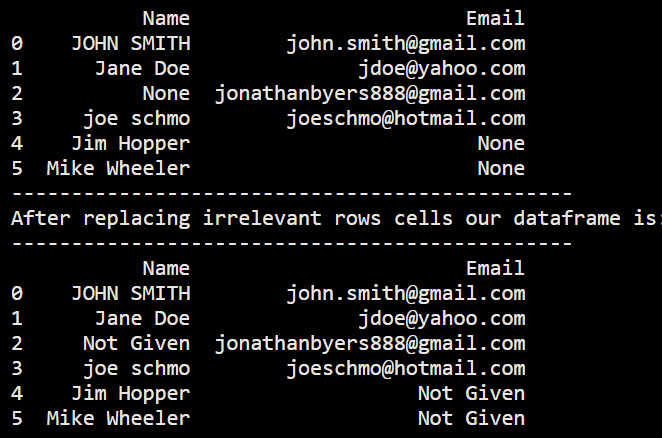 import pandas as pd df = pd.DataFrame([ ['JOHN SMITH', 'john.smith@gmail.com'], ['Jane Doe', 'jdoe@yahoo.com'], [None, 'jonathanbyers888@gmail.com'], ['joe schmo', 'joeschmo@hotmail.com'], ['Jim Hopper', None], ['Mike Wheeler', None] ], columns=['Name', 'Email']) print(df) df.fillna('Not Given', inplace=True) print('-----------------------------------------------') print('After replacing irrelevant rows cells our dataframe is:') print('-----------------------------------------------') print(df)