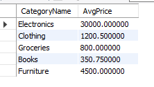 SELECT Categories.CategoryName, AVG(Products.UnitPrice) AS AvgPrice