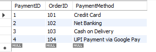 INSERT INTO Payments5 (PaymentID, OrderID, PaymentMethod)