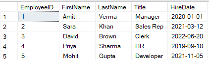 The SELECT query calls the dbo.GetFullName() function to generate the full name for each employee based on the firstName and LastName fields from the Employees table.