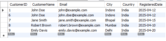 ● INSERT INTO CustomerInfo: This inserts the provided customer information (Name, Email, City, Country, RegisteredDate) into the CustomerInfo table.