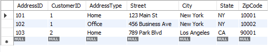 AddressType VARCHAR(50), -- Example: 'Home', 'Office'