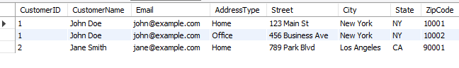 Customer 1 (John Doe) has two addresses: Home and Office.