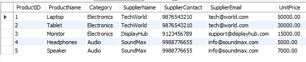 (1, 'Laptop', 'Electronics', 'TechWorld', '9876543210', 'tech@world.com', 50000.00),