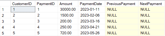 LAG(Amount) OVER (PARTITION BY CustomerID ORDER BY PaymentDate) AS PreviousPayment,