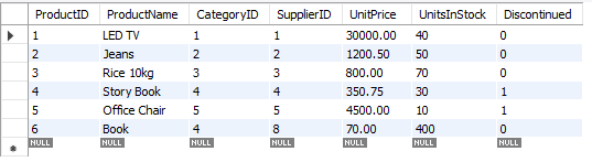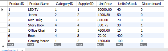 INSERT INTO Products(ProductName, CategoryID, SupplierID, UnitPrice, UnitsInStock, Discontinued)