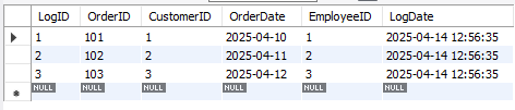 INSERT INTO Orders (...) VALUES (...): Inserts five sample records into theOrderstable which automatically triggers the log. -