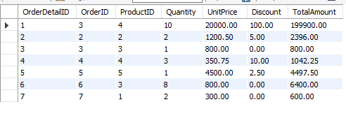 ((orderdetails.UnitPrice * orderdetails.Quantity) - orderdetails.Discount) AS TotalAmount -- Calculating Total Amount (UnitPrice * Quantity - Discount)