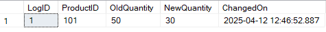 EXEC dbo.LogInventoryChange @ProductID = 101, @OldQuantity = 50, @NewQuantity = 30;